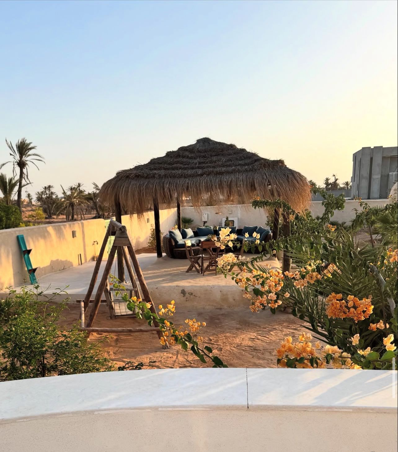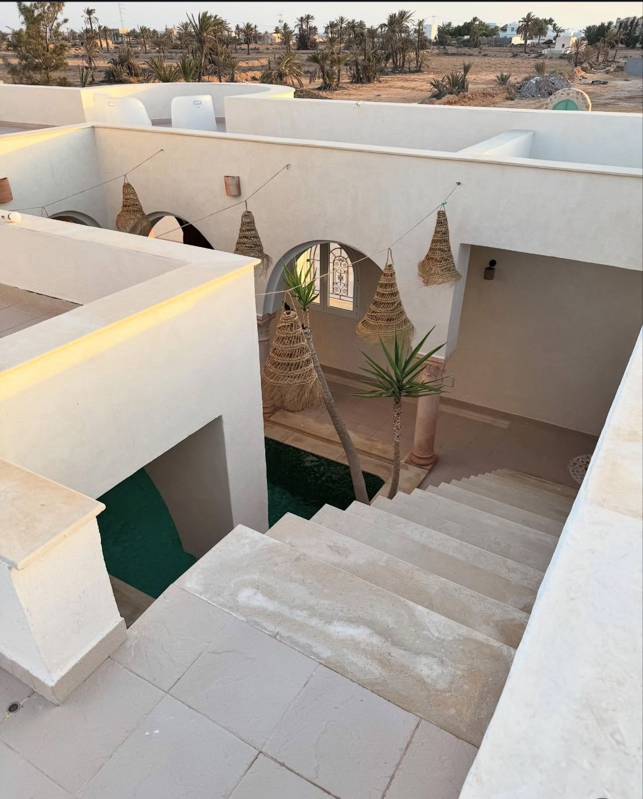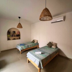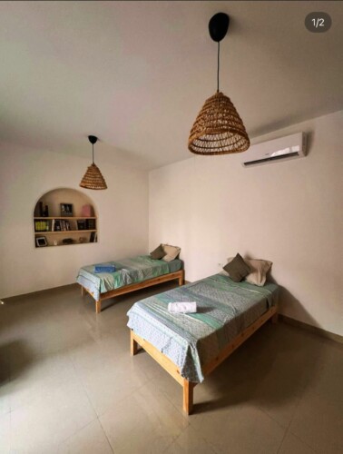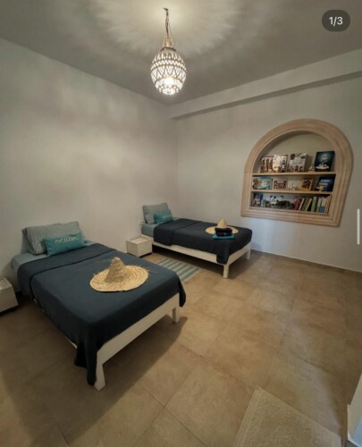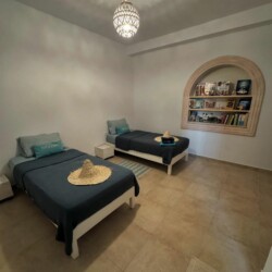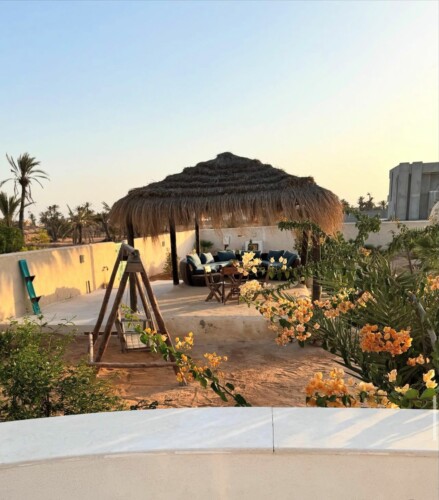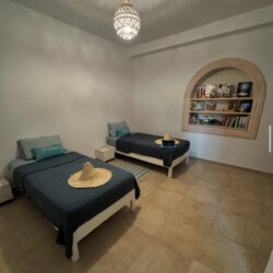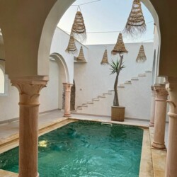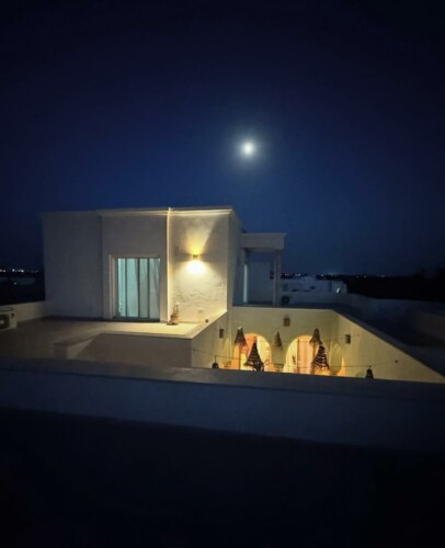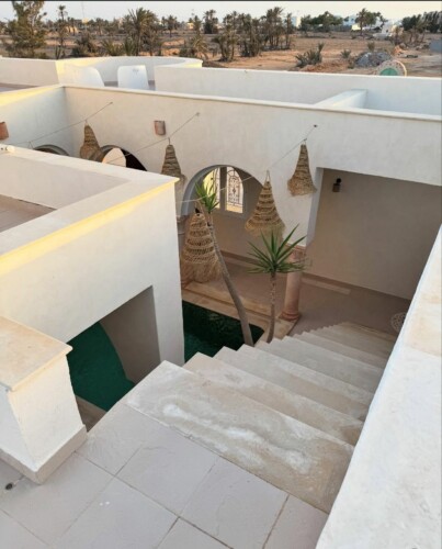 Bienvenue à Elmirya, une maison au style unique située dans le quartier paisible et recherché de Dar Bidha, à Djerba. Conçue et dessinée par ses propriétaires, Elmirya mêle avec harmonie l’authenticité de l’architecture djerbienne à une touche personnalisée et chaleureuse.