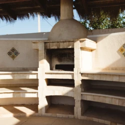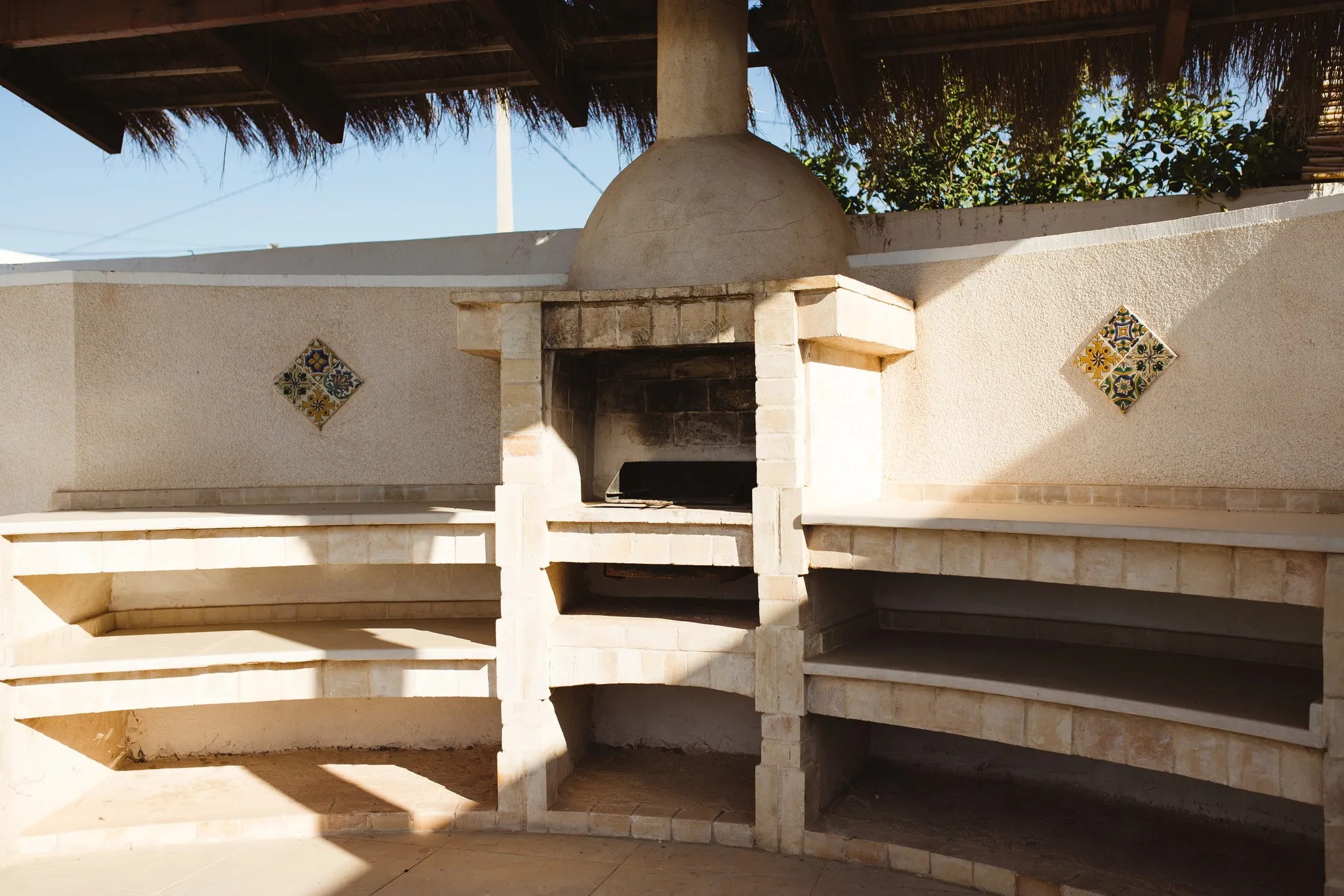 Jardin privatif avec paillote, mobilier extérieur et barbecue pour des repas conviviaux.